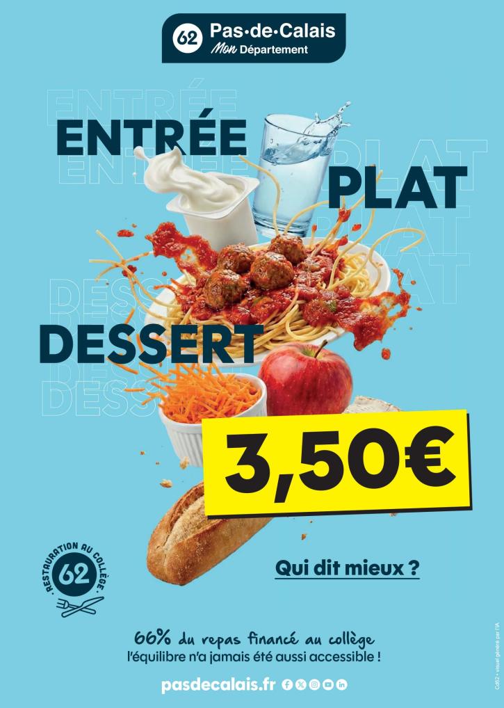 Près de 38 000 élèves fréquentent les restaurants scolaires des collèges publics du territoire. Le Département du Pas-de-Calais s’engage au quotidien pour garantir à tous ces collégiens une restauration scolaire de qualité, accessible et équilibrée. Avec un repas complet et équilibré* au prix de 3,50 euros, alors que son coût réel est de 10 euros, le Conseil départemental prend ainsi en charge près de 66 % du prix du repas. Un financement des deux tiers du prix qui préserve le pouvoir d’achat des familles et surtout permet une restauration scolaire de qualité, saine et accessible au plus grand nombre.